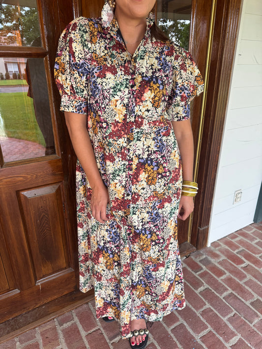 Fall Floral Stand Collar Midi Dress